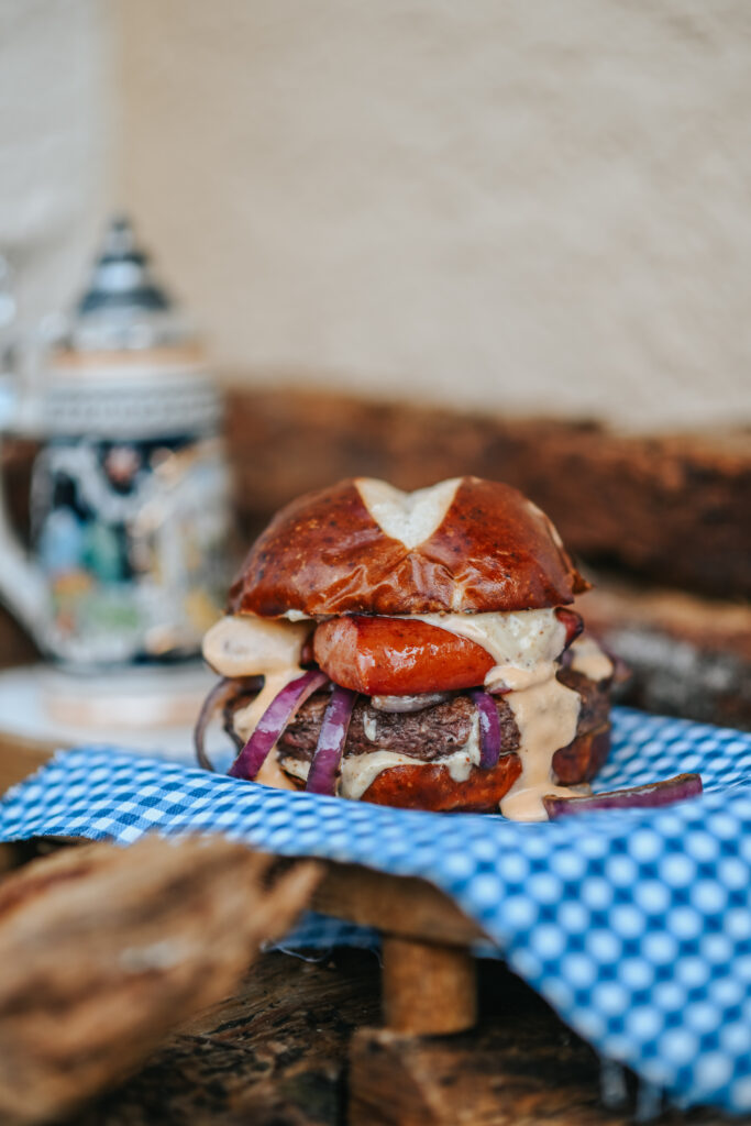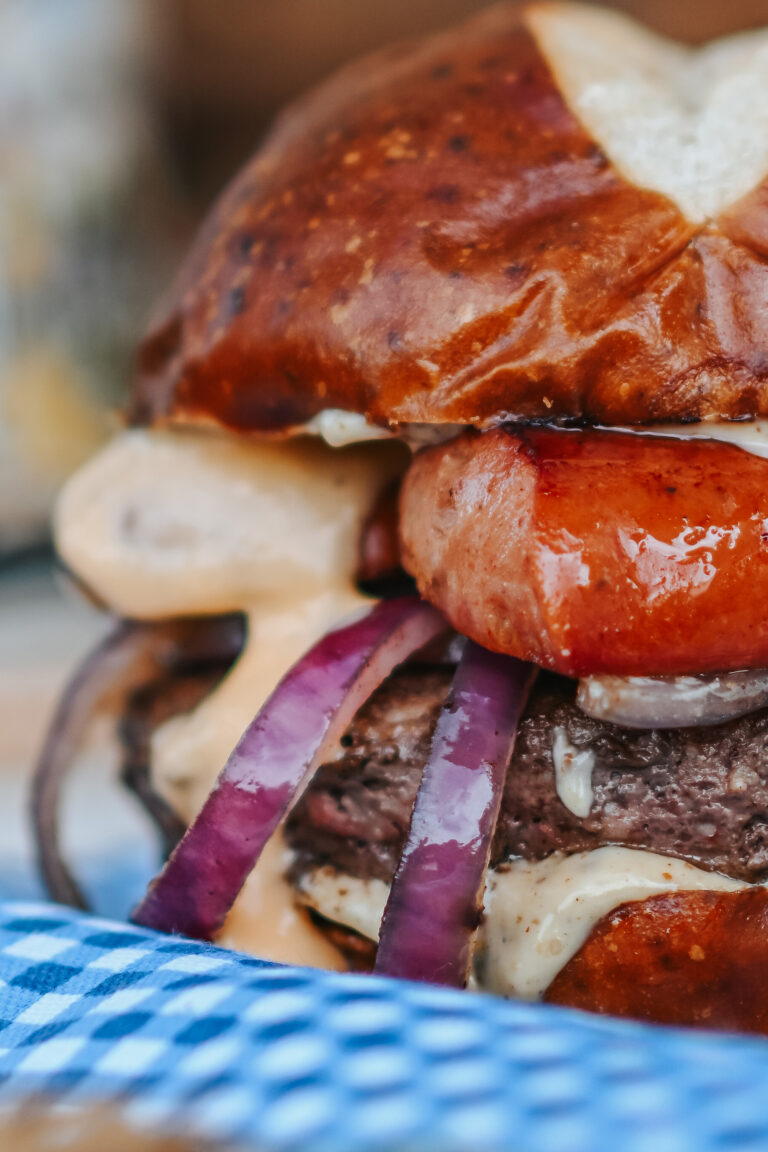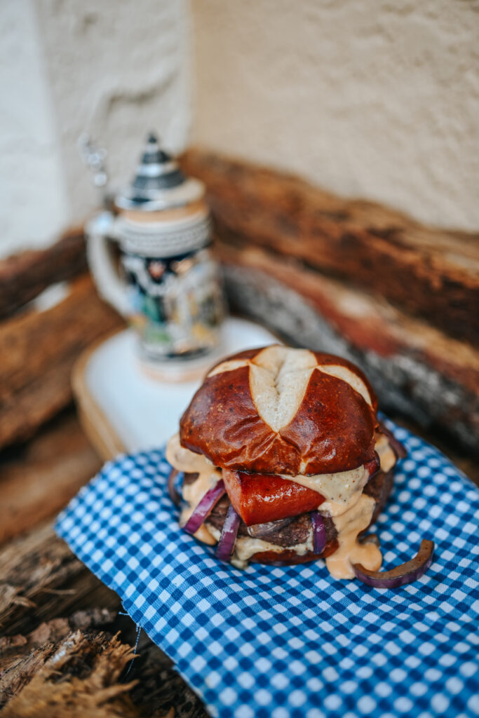 This isn’t just a burger… it’s Oktoberfest in a bun. Taste the 1/2lb fresh, never frozen patty with grilled kielbasa, sautéed onions, beer cheese and dijon mustard on a pretzel bun. One bite and you’ll be yodeling for joy.