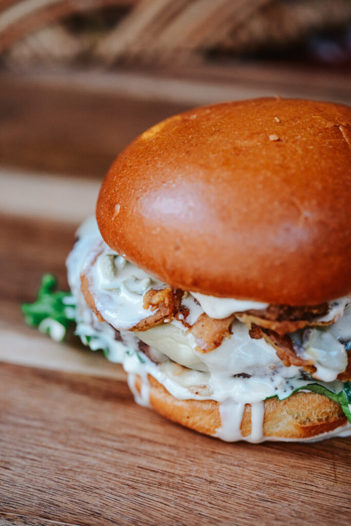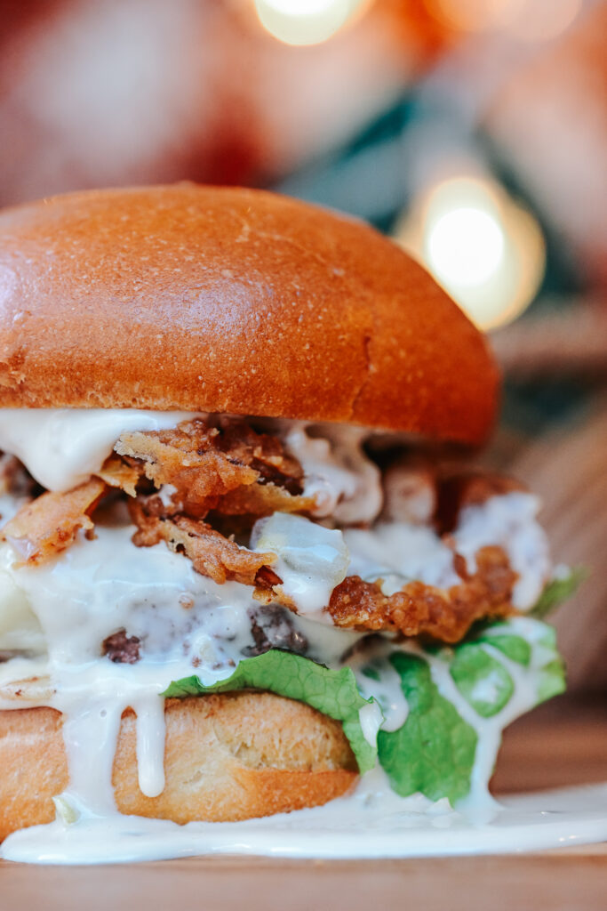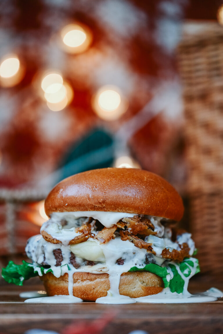 Our Winter Wonderland Patty is stacked with a ½ lb fresh, never-frozen patty, melty Havarti, crispy fried onions, garlic aioli, and lettuce—then smothered in warm poblano queso and tucked into a brioche bun. It’s basically a snow day for your taste buds.