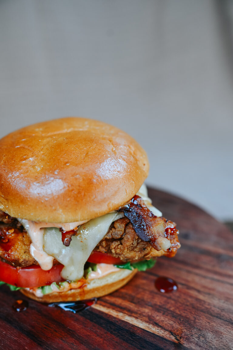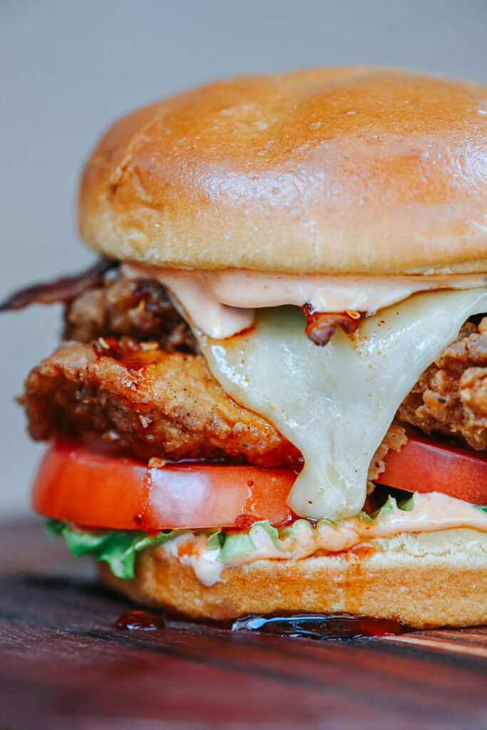 The Sweet Talker is the meet cute everyone hopes for — crispy fried chicken, bacon, pepperjack, fresh toppings, and a honey sriracha mayo drizzle on a brioche bun. Sweet, stacked, and definitely not playing hard to get.