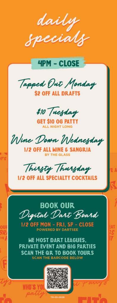 Today, Fat Patty’s aims to be your home away from home. Whether it’s before the game or during the after party, our goal is to be the place you never want to leave.